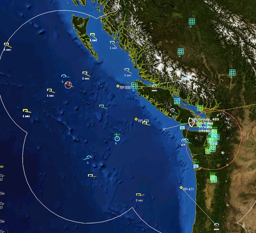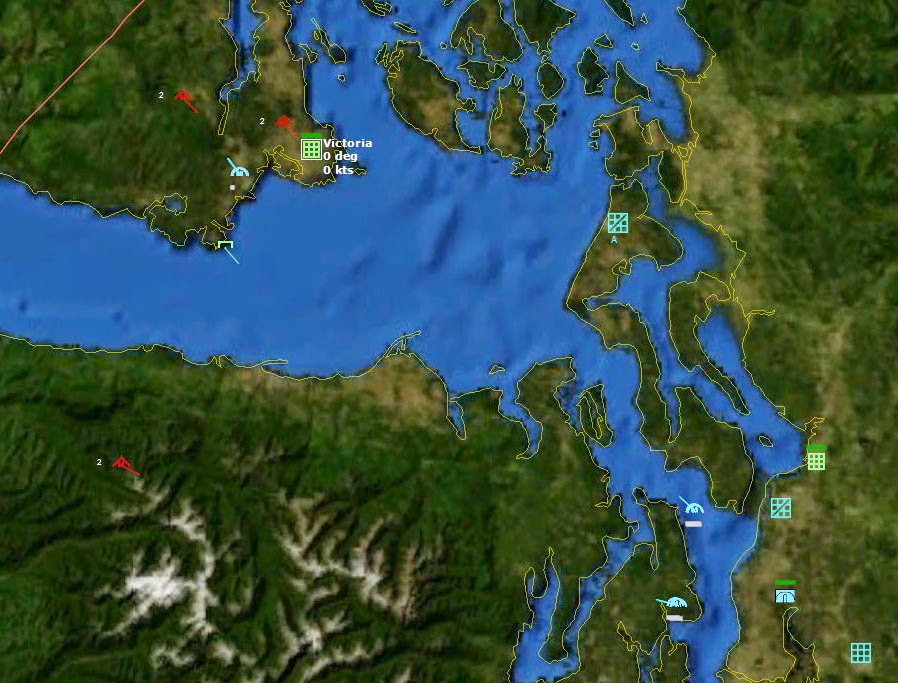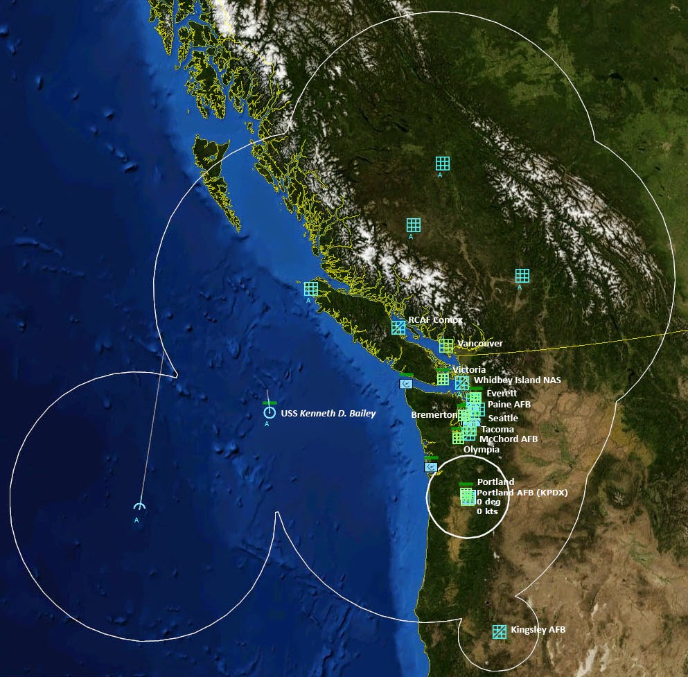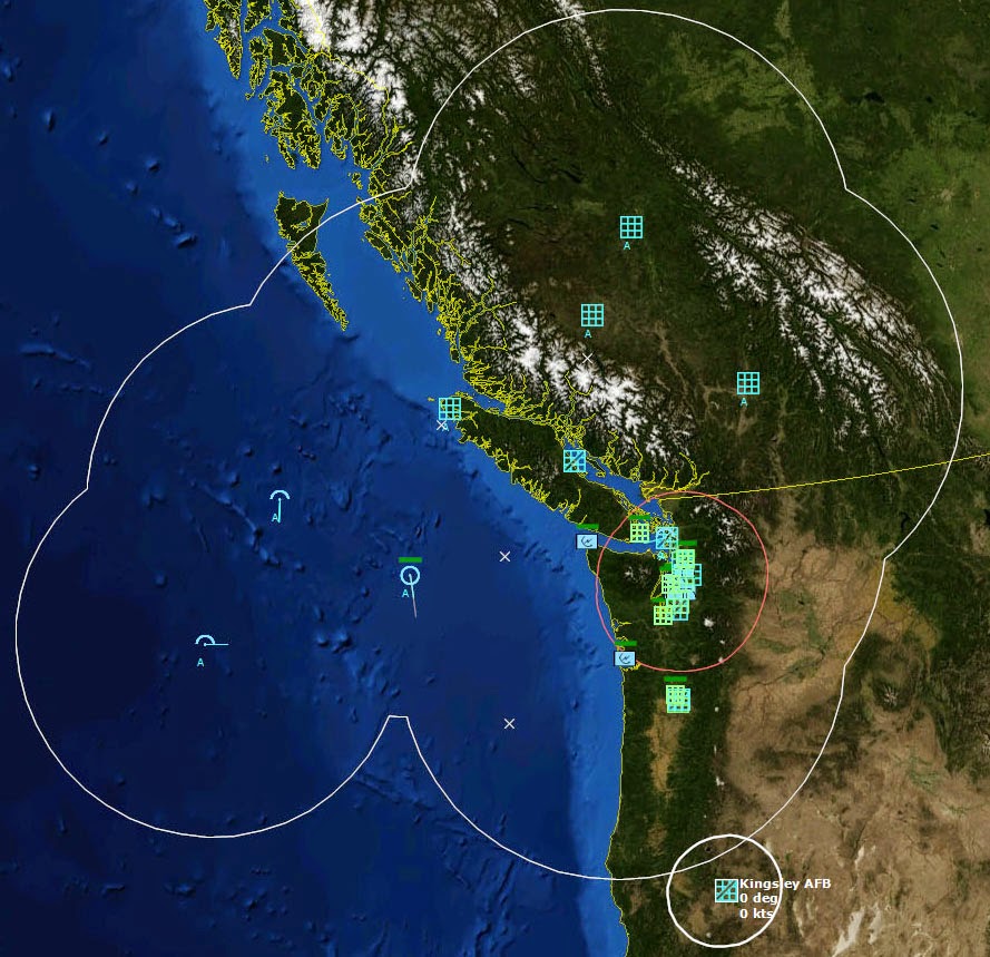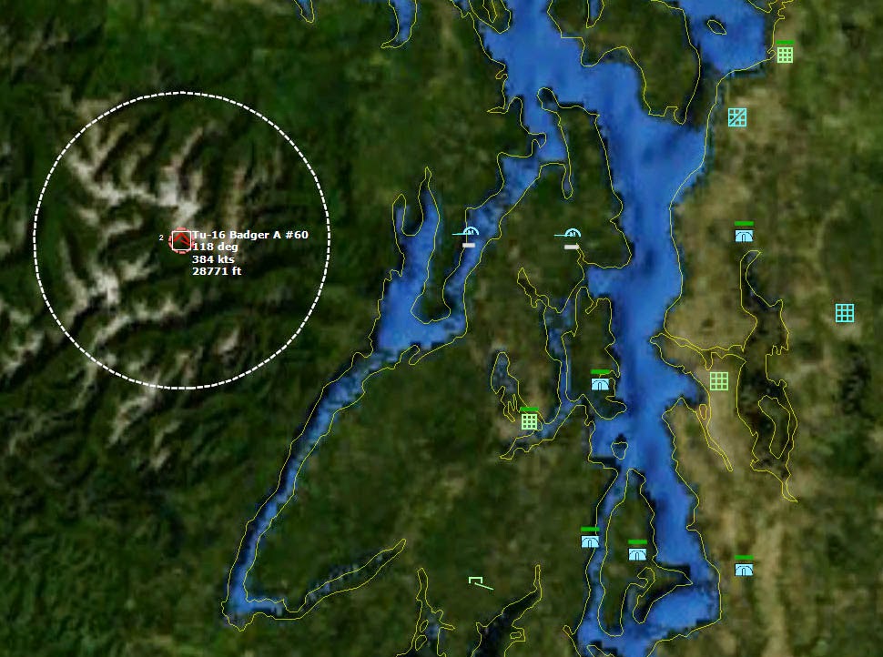 222559Z A Tu-22B Blinder A goes feet dry over Ozette Lake in Washington. Red 3 and 4, both Winchester, follow it in, while Dragon 1 moves to intercept. The Tu-22B looks to be on a course for Bremerton.