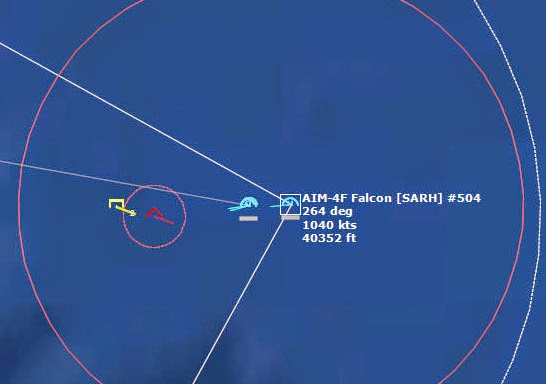 Two Genies away!Both nukes destroy the lead Blinder. King 17 and 18 close on the two remaining to engage with guns. They pass the bombers at high speed, then turn and fire a pair of AIM-4G Falcons, downing another remaining two Blinders.King Flight, Nighthawk 1, and Red 3 and 4 are all retasked to go after the closest threats.