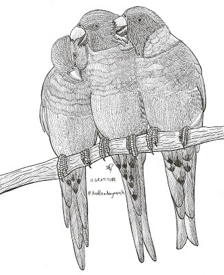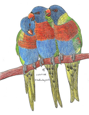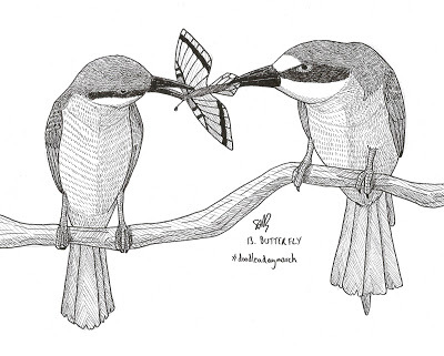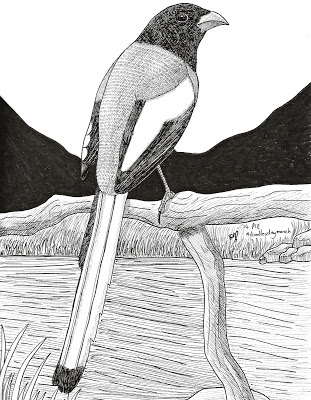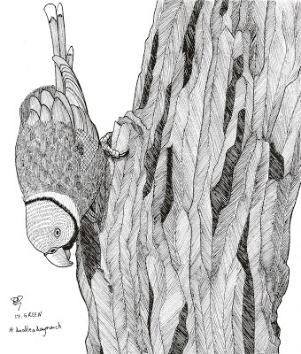 This may not make the most sense initially- how can you do green when you're working in black and white? Well, I chose a bright green plum headed parakeet, which worked just as well! Here I tried a new approach for the bark, and I was really pleased with the result. It also helped me build more pen control, though to be honest I draw in my lap and not on a table so my lines are already at a disadvantage!
