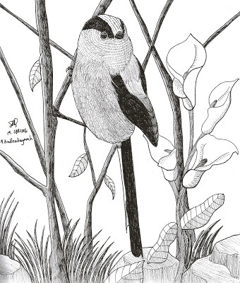 This prompt was an excuse to draw flowers and a more detailed background, so I added this to the long-tailed tit. I have very many fun poses of long-tailed tits from my bird watching photography, and it was fun to add the details here.