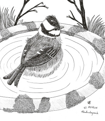 Another of my favourites, this time a blue tit having a bath. This was the first time I tried stippling, which is a technique where marks are made with dots. Very time consuming, but it gives a very different look, which I felt was ideal for the moss effect. Wet feathers are also fun to draw!INSECT