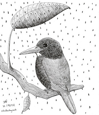 Similar to the rain prompt, but this time I decided to go for a white on black method, which turned out better. This is a white-throated kingfisher taking shelter under a leaf. I haven't quite got raindrops down, but you can only learn by trying, and I learned a huge amount during this challenge by trying different things!