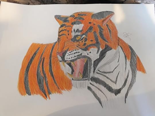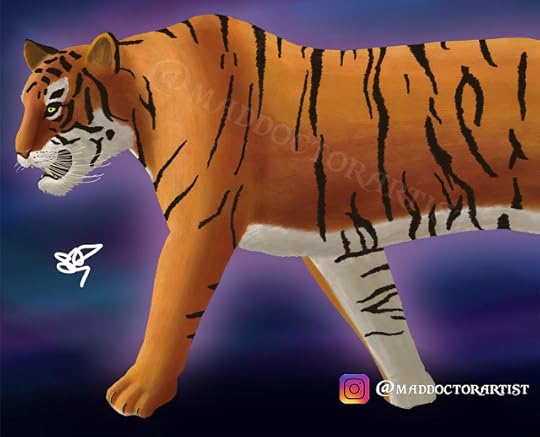 1. Anatomy- so I did practice anatomy for birds during this period, and had practiced drawing from reference. I had my own reference photo for this tiger, so I was able to create a much better rendition. The proportions are far better and make consistent sense, and there's an actual background as well! The ears are still a bit too big, and the front leg and spine aren't completely accurate.