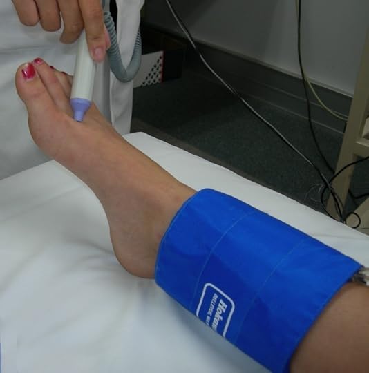 image sourceA doppler machine works on a similar principle to ultrasound, except instead of projecting images, it projects sound. This can be very useful in looking at blood flow through arteries, as blood makes sound as it flows. We can measure this while changing blood flow as well via a blood pressure cuff, and hence we can give a ratio of how good the circulation is at the hands and feet. This is known as an 'ankle brachial pressure index', where we compare blood flow in the arm and leg at a given pressure. The lower this number is, the more likely it is you have severe circulation problems in the leg, which can lead to complications.