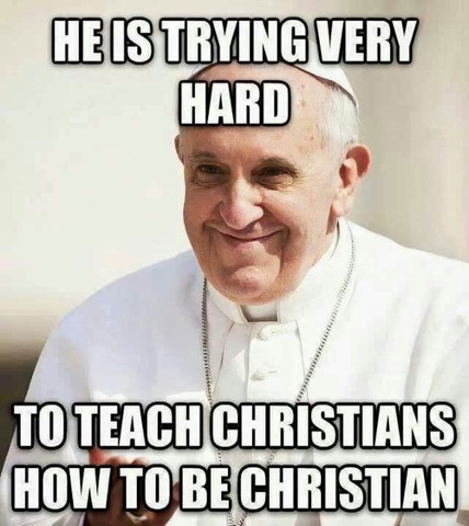 He is trying to inspire us to hold all life as sacred, rather than only holding fetuses as sacred but holding even the lives of our enemies as sacred and also holding the lives of the homeless, which the Pope ate with rather than with members of Congress, but also holding the lives of the hungry and hungry children by feeding them just as Jesus told us to feed His sheep.