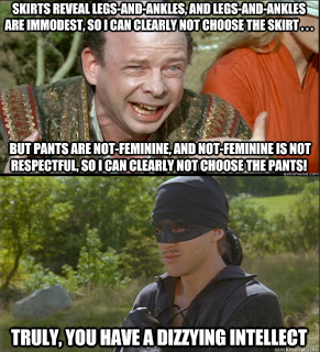 My point in all this was to explain both sides to each other and to show both sides that there are miles of common ground between these two sides. But though I see the points of both sides I also fully support those who choose to wear pants because I don't like the idea of anyone's concerns being dismissed or silenced simply because some think it's unnecessary or disrespectful.