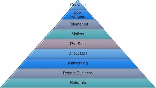 Robert J. Flaherty Prospecting is hard work... But is also job one. Prospecting is a major area of challenge for most sales people. Of course, it will be hard to be successful in sales if you don't have clients to see or talk to. That explains why many sales people are drawn to programs that provide leads because prospecting is challenging. Or they invest in a "fail proof" lead system that ends up being Pyrite...fools gold. I do a lot of consulting/coaching with agents that market products to seniors. They hear that 10,000 people a day are turning 65 but with the various rules, regulations and challenges find it difficult to locate the people that are supposed to be right in front of them. They are not alone. Most sales people in other industries have a similar view of the challenge of finding an audience. Make no mistake, marketing is tough and requires persistence and adherence to the "science of selling". As we review the possibilities for your marketing efforts, you will have to suspend judgment on what you think will work and what won't work. These methods are working successfully for those people that work them. As a sales trainer and philosopher, I do believe that people have to work "authentically". Some of the methods described over the next few days will not be true to your personality or will have to be catered to fit who you are and your talents. That is not an excuse not to do the hard work. Being able to do something but not being willing to do it are two different things. This is not a matter of whether you prospect but how you prospect. This is not a matter of if you have to do telemarketing, but instead, the script you use has to be an extension of you...authentic to your personality so it is natural and not robotic. Ok, we know we have to prospect...how do we do it? Let's begin by reviewing the types of prospecting methods broadly available to most sales people. If you are new to sales, you will have to begin at the top of this pyramid and work your way down. Not every prospecting method is appropriate for every industry or sales position. These are broad categories that meet the needs of most independent sales "warriors" who can't afford a television campaign!