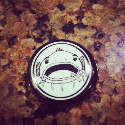 It's a catfish smoking a cigarette on a beer cap.