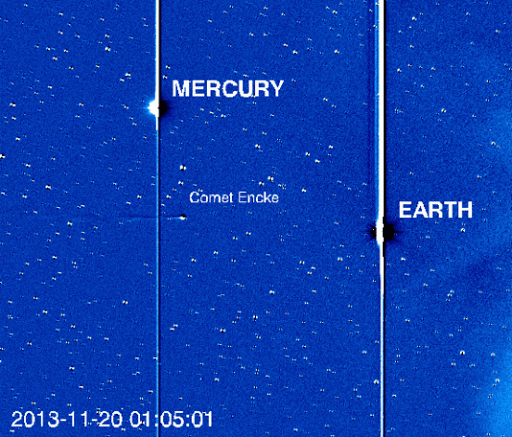 Dark "clouds" coming from the right are more dense areas in the solar wind, causing ripples in Comet Encke's tail. Using comet tails as tracers can provide valuable data about solar wind conditions near the sun.