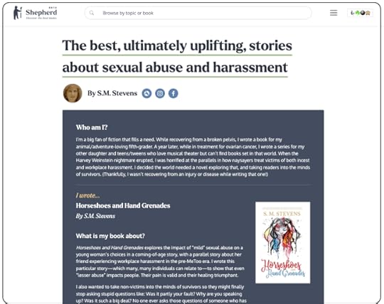 I was invited by the creators of Shepherd, a new reading resource for book-lovers, to submit a list of good reads related to my novel Horseshoes and Hand Grenades. That novel, for those who haven’t read it, is an ultimately uplifting story about two young women triumphing personally and professionally despite troubling experiences with incest in the case of one, and workplace sexual harassment for the other.