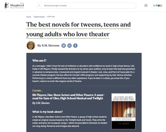 I chose that particular list topic, with Shepherd’s blessing, because drama-lovers can have a hard time finding fiction that truly puts theater front and center. As I explain on Shepherd, that’s why I wrote my Bit Players novel for tweens, teens and young adults who love theater. The first book, Bit Players, Has-Been Actors and Other Posers, turned into a three-part series for people who love theater, musicals in particular, as well as the act of creating a show (script-writing, song-writing, production, etc.).