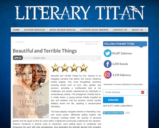 Other Early AwardsIn addition to the just-announced American Fiction Award, you may recall that Beautiful and Terrible Things also won a Literary Titan Silver Book Award. Literary Titan is an organization of professional editors, writers, and professors. Their review of the book said, “Stevens’s prose is lyrical and rich, capable of drawing readers deeply into the emotional landscape of the story—from introspective quietude to the fervor of protests and activism. The authenticity and emotional resonance of each scene are palpable.This novel remains with you, a testament to the indomitable human spirit and the complexities of life it navigates.”