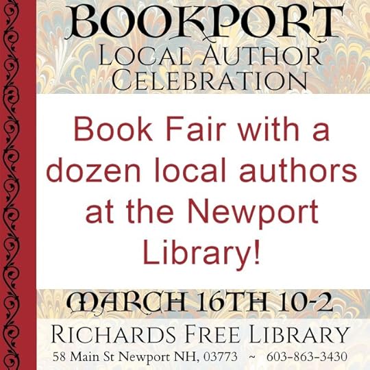 Saturday, March 16, Bookport 2024 at the Richards Free Library, 58 N. Main Street, Newport, NH, 10:00 AM – 2:00 PMSaturday, June 29, Local Author Meet-and-Greet at the Fuller Public Library, 29 School Street, Hillsborough, NH, 10:00 AM – NoonBoth book fairs are in gorgeous, historical buildings. If you haven’t visited, come to these events and revel in the amazing architecture of southern New Hampshire’s older construction.