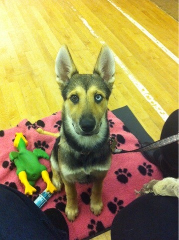 Here is our lovely (if very active) husky/ rottie/lab cross, sitting nicely, ready for her time at puppy school. What the trainer didn't realise of course was that while taking this picture, we were holding a bag of treats above my head!