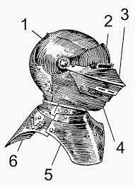 HounskullHounskull ~ This one isn't so well known: A hounskull was a form of steel helmet worn in Europe in the Middle Ages, almost invariably by knights and other mounted men-at-arms, from the middle of the 14th century until approximately 1420. It offered extensive protection for the wearer's face at the cost of some visibility, but its distinctive visor could be raised or lowered at will.