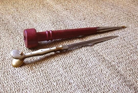 A dirkAnd we also have our weapon, the dirk. A dirk is a long thrusting dagger. Historically, it was a personal weapon of officers engaged in naval hand-to-hand combat during the Age of Sail, as well as the personal sidearm of the officers of Scottish Highland regiments, and Japanese naval officers. And just to let you know, THIS is something a pirate would carry. Happy blogging, everyone and I will see you tomorrow.