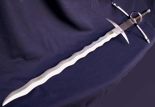 FlambergeFlamberge ~ a flame-bladed sword or wave-bladed sword has a characteristically undulating style of blade. The wave in the blade is often considered to contribute a flame-like quality to the appearance of a sword. While largely decorative, some attributes of the waved blade were useful in combat. The two most flame-bladed swords are rapiers or zweihänders, although there have been other sword types with flame-blades.There. Hope that helps figure some more stuff out! See you all tomorrow.