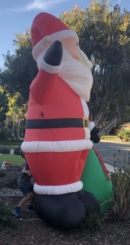 Our neighbors from where we used to live come over to help us decorate and put up lights over the holidays. They are more hands-on than we are and their kids are grown up so they’ve been there, done that. They are also friends we love to hang out with. And without them, our large blow-up Santa wouldn’t exist. But it can be tough to keep him upright and little people often have to adjust him.