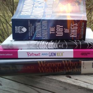I thought I’d kick off the festivities by sharing photos of my “to be read” and “currently reading” piles. The shorter pile is what I’m currently reading (or re-reading, in the case of Women Who Run with the Wolves). The ones I have underway on the Kindle are Chillpreneur by Denise Duffield-Thomas and Who the F*** Am I To Be A Coach? by Megan Jo Wilson.