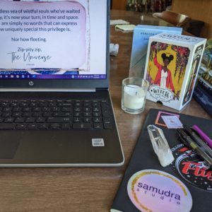 This week I attended my biz coach’s spring retreat. It was virtual and ran for three days. The picture is my space as I got ready for the first day. Yes, we use Tarot cards and candles at our biz retreat. You know I wouldn’t go for one that’s not witchy in some way!