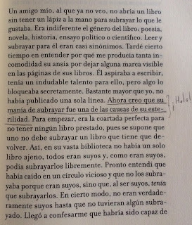 Esta práctica “subrayatoria”, que en otro tiempo me hubiera parecido atroz, hoy me resulta harto comprensible. Incluso he llegado a desear poder hacerlo, aunque aún me contengo. Sé que esta aversión es un problema mío, y no pretendería imponerlo a otros. También, sé que la incapacidad de hacerlo proviene de una noción de la literatura como algo sagrado, con lo cual además se confunde una cosa por otra: literatura y libros no son lo mismo.