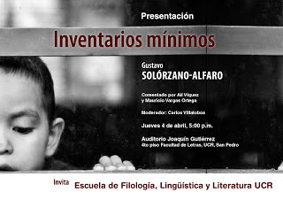 Ya vio la luz Inventarios mínimos, mi más reciente libro de poesía, un conjunto de 40 textos escritos entre 2007 y 2012. Desde hoy, pueden adquirirlo en Libros Duluoz (barrio Amón) y a partir de las próximas semanas en la librería de la UCR y en las librerías de la Uned.
