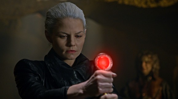 And then Emma arrived. But was she there to take the baby? No. Apparently she sped up Selena's pregnancy to get rid of the baby from her own would-be useable vessel. Wow, I made that more confusing than it needed to be. OK, she kidnaps both Hook and Selena down to her evil lair where she assures him she is still good and wants to banish the evil. But the only way to do that is to imbue all of her evil in someone else--Selena--and then cut her down with Excalibur. And then things went uh-rye.