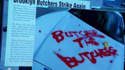 For a brief moment, the writers tease us with a potential case that has nothing to do with Jane's tattoos when two cops are shot dead in the street. A message written in blood (or possibly just red paint) reads "Butcher the Butchers." The loving term "Butchers" is used for the street name for the cops of the 65th NY precinct as just last year the cops set off a racial riot when one of them gunned down an unarmed black man. Though some of the cops got fired, everyone was on high tension in the neighborhood ever since. Now with the cop murder and the Butcher nickname used, they think it's a revenge killing. And, oh yeah, Jane had a tattoo of a butcher's knife with 65 written on it and surrounded by what first looked like sniper crosshairs.