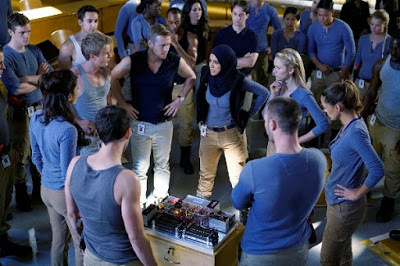 As the story switches back and forth we see that Alex and the gang are all in danger both in the future and the past, or the present and the past. Ahh, now I'm getting confused. Back as trainees, their mid-term exam was to use all of their skills acquired from the first third of training to complete a test. Thinking it a written exam after receiving a paper, they quickly realize the paper is blank and start to consider other ways they could be getting tested. Alex thinks it has something to do with the amount of papers they received. The group hands in the paper and realize they are one piece short, a 60 out of 61 people. When they use the classroom surveillance to discover it was the rich kid Fletcher who never got a paper, he freaks out about how he shouldn't have been there and was failing out anyway. He storms out the room and triggers a full classroom shutdown that shuts the blinds and turns off the AC. Now they have to figure out if he was a real traitor/danger to his fellow trainees like the suicidal Mormon was earlier in the year, or if he is part of the test.