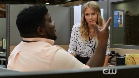 Hank with EvieHer main coworkers consist of a group of three she regularly interacts with. Hank (played by Johnathon Langdon) is a known conspiracy nut, too, so she has to go to him first. Lovable black huggy bear with a medium-top fade, he is her straight male road-dog and looks to be her closest friend outside of her family. One of the better comedy elements of the show, his convincing-hinging-on-over-the-top delivery, and jovial nature keep the sunshine going as both Evie and Xavier are all smiles all the time. It’s like everybody’s on lollipop-flavored PCP and just lovin’ life and livin’ it without a care in the world. He laughs at Xavier’s assertion that the world will end with the strike of an asteroid... because he knows that it will end by the hand of the Russians starting a nuclear holocaust. He’s got a calendar where he’s marked it and has info from the government where supposedly a secret bunker is going to store all the important people the day before the nuclear war kills or mutilates everyone turning them into Whitewalkers or something (made that last part up).