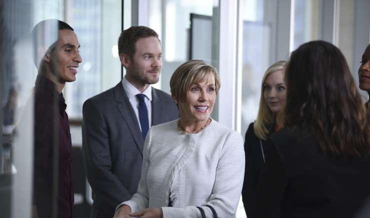 Enter Jake Gregorian (played by Rescue Me vet Daniel Sunjata) as our other top lead. A high-powered attorney to the stars of California, he has not only represented the young techie for years but also knows the man’s wife. He and Julia also have a history that runs back some years as they are chummy in the elevator and all the way up to the newsroom, even bothering to throw careless flirty banter between each other as he mentions hearing about her boyfriend’s court confirmation. A romantic relationship between them in the future? Yeah, it is not only possible but highly probable if the show makes it past two seasons. For now, she plays rather dirty as she thrusts him into the guest seat on LHL knowing that he doesn’t know that one of his biggest, richest clients has a warrant out for him and is currently resisting arrest in his house while the police stand outside. Breaking news with a copter-feed and everything, they lead the show with that and catch the man off-guard, forcing him to answer surprise questions about his client when he came to talk about something completely different. When he deflects, turns the narrative to his liking and they cut to break, he and Julia meet up behind closed doors only to laugh and glad-hand each other about the twist they just did.