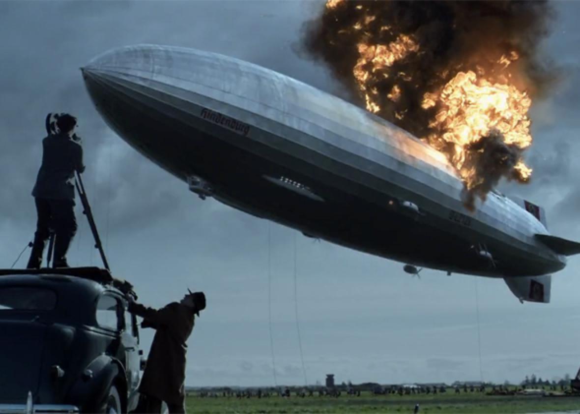 They throw on some 1930s appropriate garb (as close as they could get it) and take off into the past in a backup time machine that Mason had built as the first prototype. Mama always said if you're gonna build one time machine, build two time machines. And here I point out how I actually think it is kind of cool that the two machines are eyes that travel back into history; they can see history unfolding before them. I see you, producers, trying to be poetic. The time and place correct, they stop to watch as the Hindenburg passes overhead, still a few hours away from making its fateful landing a couple towns over. Their mission: find Garcia and stop him from doing whatever he is there to do that will ruin history.