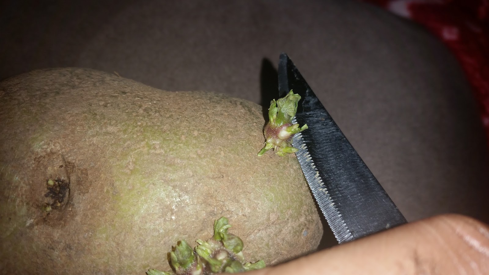 This Is The Third Potato. I'd Recommend Letting The Eyes Grow BiggerStep two.Once the eyes are big enough (see the size above) you want to pull them off. Another good gauge for sizing the eyes is to look at the sides and see if there are rings of white nodules or bumps circling around the entire eye. These bumps turn into roots. Also, it is a good idea to make sure that the tips have shown some signs of greening or have closed leaves. In the video below, you can clearly see that the tips of the spuds look like a closed flower right before it blooms.Step three.Pick these eyes off, making sure not to squeeze it too hard. You can also cut it off, though I find that gently twisting it off works best. You don't want any of the potato left on the end, unlike other methods.