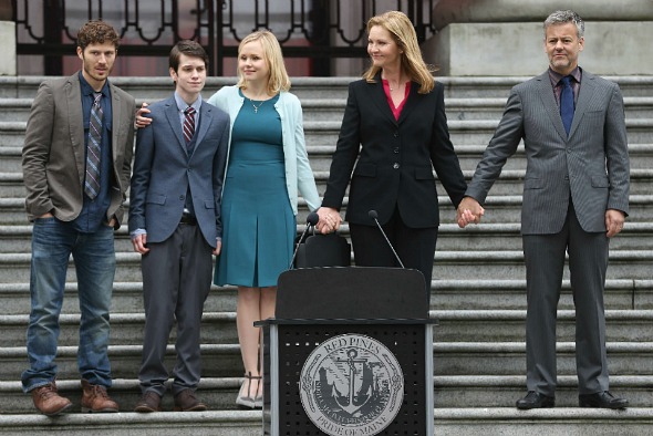 That's right the mother, played by Joan Allen of... well, Joan Allen fame (I ain't got time. Check her stats!), up until three episodes in has been mostly useless character-wise. There was some vim and raucousness from her in the third episode where she went off-script during an interview about getting back to the campaign trail after Adam's return, but much of that has sizzled. The show seems to have billed her as the one we are to root for, but even as the doe in the headlights, she fails to garner real sympathy in both the present and the flashbacks. Even as her emotional matrix widens, she feels more political and cold in her home with her family than she does out in the public. Isn't she grieving? Or is she even happy her son has returned? In seeing tons of local (remember, Ohioan here) and national coverage of the Amanda Berry, the other two and Ariel Castro's story, the parents were always near deafening tears to learn that they're daughter was home. I know, the case of Berry is different, but still I can't help to think that the parents' reaction would be much closer to a roller coaster heart drop than the sorta Annie Hall "La-Di-Da" that we've been getting.