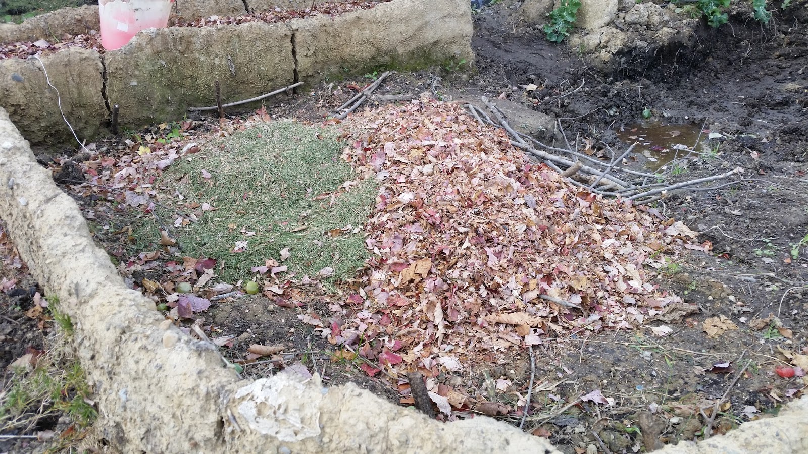 Because of this potential problem, what I did was make a one-layer compost bed for the established ornamental gardens. The leaves do not lay directly on the soil preventing them from not only causing soil-borne pathogens from spreading but also from them robbing the soil of more nitrogen than they put out. However, beneath them is a mixed layer of dead grass and coffee grounds. Experienced gardeners know that those pull nitrogen from the soil too during their breakdown and come spring I do expect for my plants not to be as green; however, they are also rich sources of nitrogen and organic food matter for the worms and other beneficial soil organisms. With it remaining warm for the next few days and wet, many of those organisms will get to work on breaking that food down before the ground freezes. The wet leaves will act as an insulating barrier to keep them closer to the surface soil. I expect the leaves to be here for the next two seasons to create a golden to brown mulch and keep weeds down. I tried this last year on a side bed with nothing but a bush growing in it and it worked.