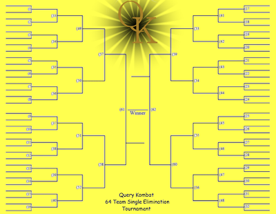 To celebrate, we'll also be giving away three Free Passes starting Friday. A Free Pass will allow the winner to skip the screening process, pass Go, and head directly to a spot among the 64 Query Kombat entries. The Free Pass involves sharing a clever or amusing nickname. Just like in the NCAA basketball tournament, all our entries will have "school" nicknames by which they will be identified in the brackets.