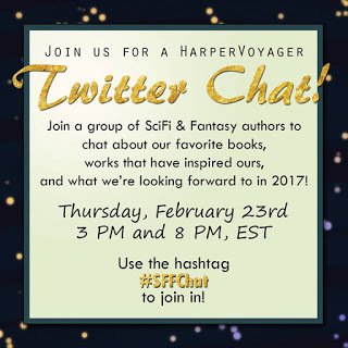 Come chat with a group of science fiction and fantasy authors from Harper Voyager. The chat will be on twitter at 3:00 pm and 8:00 pm EST this Thursday, February 23rd. Find the chat at #SFFChat.