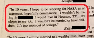 If you can't read it, it says: In 10 years I hope to be working for NASA as an astronaut, hopefully Commander. I wouldn't be living in (hometown). I would live in Houston, TX. It's closer to my job. I wouldn't be married or have children. It's too soon out of college.