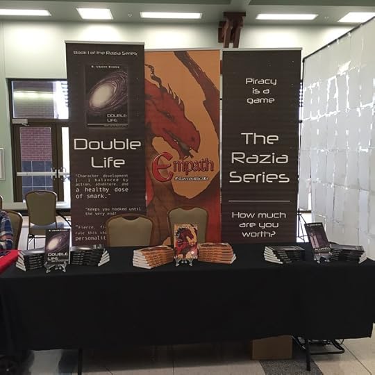 Get Yer Swag OnOnce you've got a con and a date, it's time to focus on your booth. You'll be pulling people into your booth with your pearly whites and charm and charisma (right?), but you need to make sure your booth set up looks professional. Trad pubbed kids--talk to your publisher. They might even have stuff that they can send you to use and then you don't have to make your own. They can also send you books. For me, I have three eight foot banners that I hang behind my booth. Sometimes I use all three, sometimes just the Razia one and the Empath one.