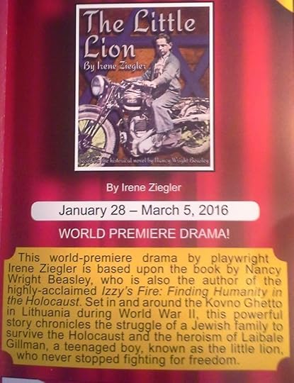 My new play, The Little Lion, which I wrote while housesitting in CA this summer, will have its world premiere January 30th, 2016 at Swift Creek Mill Theatre in Virginia. Adapted from the novel by Nancy Wright Beasley and inspired by true events, it follows the courageous efforts of a Jewish adolescent during World War II as he attempts to free his family from the Kovno ghetto in Lithuania. Photos by Robyn O'Neill.