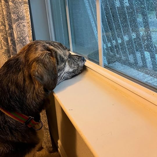 So, I’m taking this as a good sign and leaving you with a pic of Tess the Pup watching the rain. She knows her walk tonight will be delayed. On the bright side, that walk will be splashy and cooler.