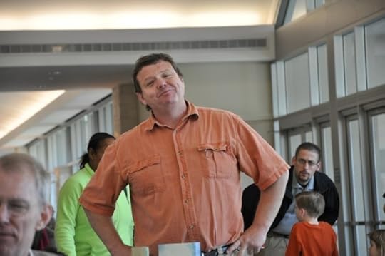 Here’s award-winner Brian Floca. With dogs. And apparent commotion off to their left. At a quarter to seven.
