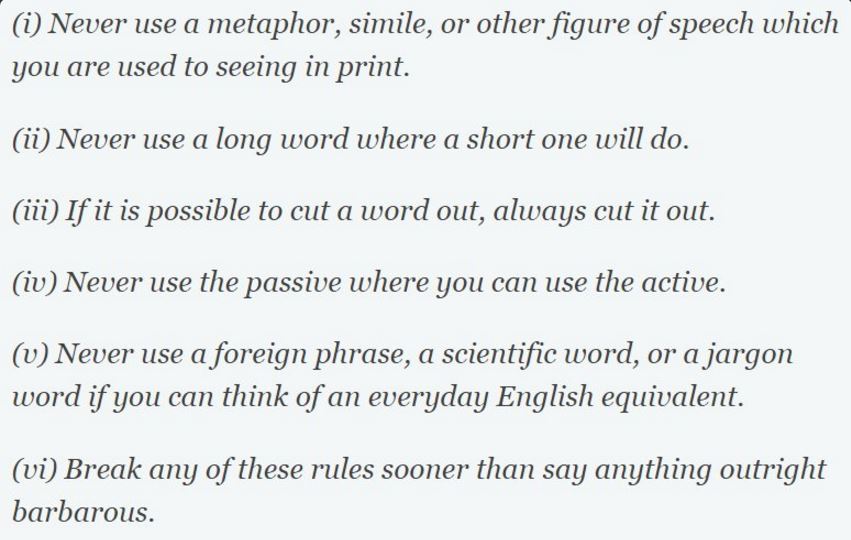 A famous and beloved set of guidelines. The first is demanding but essential; the second does not mean "dumb down your text" (something Orwell doesn't do); the third does not mean "only write in short sentences" (something Orwell doesn't do); the fourth adds energy and power and specificity to your prose; the fifth is simple common sense; the sixth makes you, the writer, responsible for avoiding barbarity. If only politicians made a point of observing all six.
