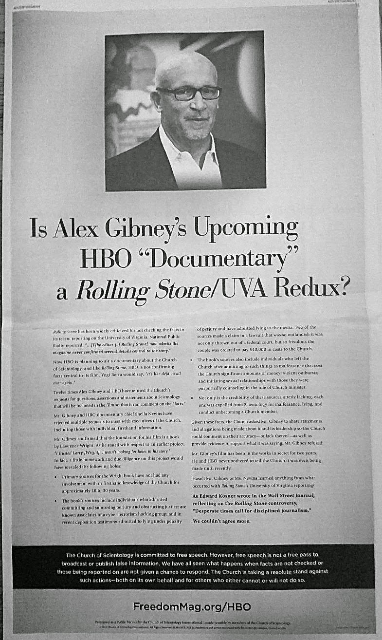 It's not every day the NYT runs a full-page ad--and a story reporting on it. Today this happens re: a response by Scientology to the upcoming and much-awaited Alex Gibney film. See Times story and another here (which first published the ad itself, see below).