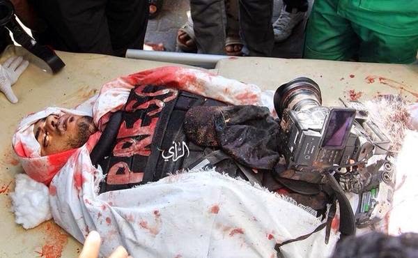 Photo below of video journalist Khaled Hamad killed last night in Gaza. Note shirt. His father at his funeral.