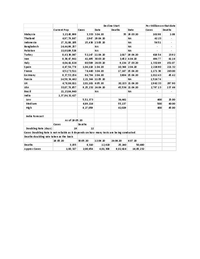 Here is where I stick my neck out. I have done an international per capita model of cases and deaths and used it to forecast what will happen in IndiaBroadly there are 3 types of countries and progression of Covid 19. Asia including Turkey and Iran where the disease progressed more rapidly and counties like Malaysia and Thailand which have hardly been touched at all.Europe and North America which are broadly similarBrazil is still to stabilizeI have taken the dates on which a decline started of cases and deaths for each country and worked out the per capita cases and deaths on that dayThis analysis results in the conclusion that India is likely to behave like West Asia - tropical counties of Malaysia, Indonesia and Thailand will do better than India.Deaths are more reliable than cases as a measure for forecasting as cases are dependent on how much testing is going onBased on the above analysis, my prediction is that India deaths/day will start declining around 1 July to 10 July. The number of deaths in India (based on a 7 day moving average are doubling in 12 days) will reach the projected number of 35,000 - 62,000 after which they should start declining as per the model.The decline will start earlier in places like Ahmedabad, Pune and Mumbai where the spread is already greater. However, as a whole the country will start seeing the decline on the dates stated above.This model assumes that the per capita infections and deaths when they reach a certain level in the population the infection progress recedes. It must be something similar to herd immunity but the pundits are reluctant to use that wordThe more you ease off from the lockdown, the quicker we will reach the tipping point. The doubling rate will become quicker.It would be great to hear your reactions on this post.