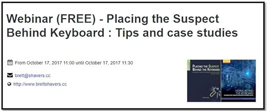 Not to take up a lot of your time, but how about a half hour of talking about placing a suspect behind a device? I want the webinar to be live in order to take as many questions as I can squeeze in, while also packing in as much as I can in half an hour. If you'd like to attend, register here: http://brettshavers.cc/index.php/events/event/23-webinar-free-placing-the-suspect-behind-keyboard-tips-and-case-studies. SIDE NOTE: There will be a bonus in the webinar that most likely be of interest to you.
