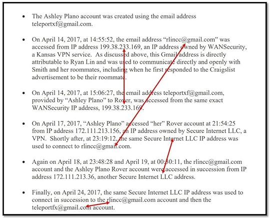The suspect, “Lin”, erred in using variations of his name in social media accounts. It’s only a clue, but important to build upon. In all cyber cases, keep track of user names. Sometimes there is a reason a username was chosen and perhaps clues to other information. For each online service, such as Instagram, also consider that accessing each service can be done using many different devices from many different locations on many different occasions. With each connection, the suspect risks being discovered either by his mistakes or service provider. That means for you to look at every connection of every message, text, email, or login.