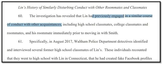 Past behavior is a good indicator of future performance/behavior. In Lin’s case, based on his past behavior, I would say that this is what he is: a cyberstalker. Once you read the entire affidavit, you’ll see what I mean.