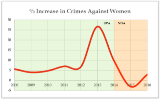 The Crime Statistics 2016 is the most recent publication from the NCRB. Comparing the latest 2016 data with that of the previous yearssince 2008, it can be seen that there’s a drastic reduction in the rate of increase in the crimes against women and children, since 2014, since the recent NDA has come to power. Having said that, that’s nothing to be happy about. The spike in the crimes reported around 2013 might be due to more awareness, post Nirbhaya rape case, and media and public scrutiny. Since 2014, the reporting would have stabilized, and there has been a steady increase in the crimes since then. But doubtless, it can’t be said that the crimes have increased at significantly higher rates since 2014, compared to those in the past 10 years. It could be surely said of the current government that it has failed to reduce the crimes. But that’s an altogether different point.